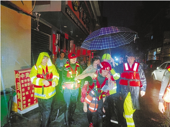 | 9月6日,在福州市长乐区玉田镇,消防救援人员将一名被困家中的老人背出。 受台风“海葵”影响,福州遭遇持续性强降雨。据气象部门统计,9月5日21时至6日5时累计雨量突破了福州乌山国家气象站3小时和6小时最大雨量纪录。 新华社 林善传 |