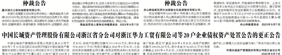 中国长城资产管理股份有限公司浙江省分公司于2023年7月10日在《浙江法治报》刊登《中国长城资产管理股份有限公司浙江省分公司对浙江华力工贸有限公司等20户企业债权资产处置公告》,公告中“截至2023年4月20日,该资产包债权总额为117,178.19万元,其中本金为81,825.77万元(利息计算截止2023年4月20日,之后的利息依据借款合同计算,但有法院判决则以生效的法院判决书内容为准,涉及破产的,以管理人认定的金额为准)”有误,更正为“截至2023年4月20日,该资产包债权总额为109,476.22万元,其中本金为78,325.31万元(利息计算截止2023年4月20日,之后的利息依据借款合同计算,但有法院判决则以生效的法院判决书内容为准,涉及破产的,以管理人认定的金额为准)。”其余内容以原公告为准。