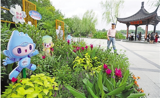 9月6日,杭州环西湖景区各节点的亚运主题花坛、花境、花艺小品等陆续布设完成,营造出浓浓的“花满杭城迎亚运”赛事氛围。