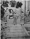 在做客、宴请之时,射箭则成为了一种社交活动。如《仇英款射箭图》,画面中描绘了明代官宦人家邀请客人在庭院中射箭的场景。