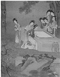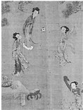 围棋活动自唐代开始在中国古代女性中盛行,到清朝时期已成为宫廷、贵族妇女中广泛盛行的一项体育活动。《仕女弈棋图》描绘了春临大地、风和日丽之时,女性相聚在一起,以弈棋、观鱼、赏花为戏,彰显雅致情趣。
