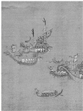 划龙舟比赛是“取其轻利”,看谁划得最快。在“鼓击春雷”“棹歌乱响”中,水面艘艘龙舟,犹如“飞凫”,御风疾驶,棹影翻飞。为了增加观赏性和刺激性,参赛龙舟到达终点时,划龙舟者还要“翻身径入”水中,抢夺设在水中的浮标。《设色出行图》描绘了仪仗出行、龙舟竞渡等人物众多、场面恢弘的生动场景。