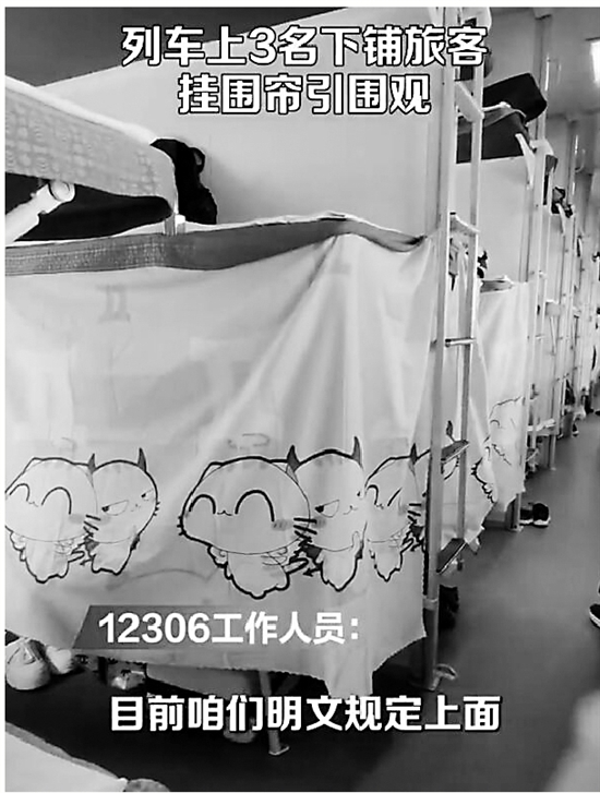 近日,新疆乌鲁木齐,三名下铺旅客在自己床位上挂围帘引来周边旅客围观。对此,12306工作人员称,目前没有明文规定旅客不可以挂围帘,需要向周边旅客协调好,在不影响其他旅客的情况下进行使用。