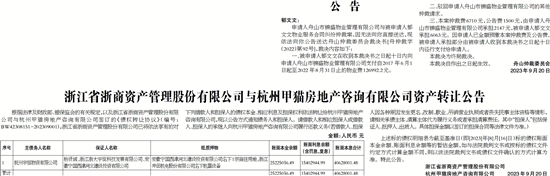 根据法律及财政部、银保监会的有关规定,以及浙江省浙商资产管理股份有限公司与杭州甲猫房地产咨询有限公司签订的《债权转让协议》(编号:BW42308151-202309001),浙江省浙商资产管理股份有限公司已将依法享有的对下列借款人和担保人的债权本金、相应利息及担保权利依法转让给杭州甲猫房地产咨询有限公司,现以公告方式通知债务人和担保人。请借款人和相应担保人或借款人、担保人的承继人向杭州甲猫房地产咨询有限公司履行还款义务(若借款人、担保人因各种原因发生更名、改制、歇业、吊销营业执照或者丧失民事主体资格等情形,请相关承债主体、清算主体代为履行义务或者承担清算责任。其中“担保人”包括保证人、抵押人、出质人。具体担保金额以签订的担保合同等法律文件为准。)