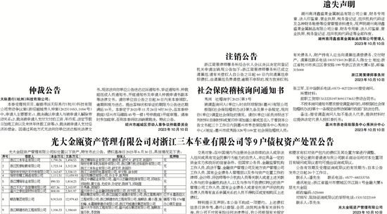 光大金瓯资产管理有限公司对浙江三本车业有限公司等9户债权资产处置公告