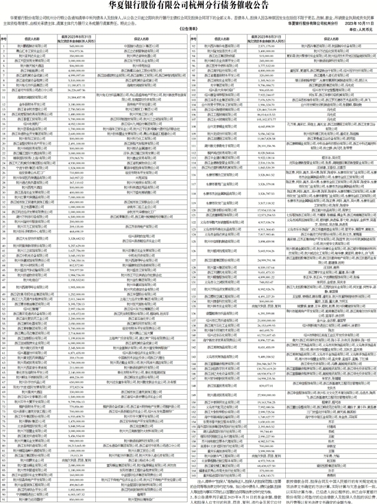 华夏银行股份有限公司杭州分行特公告通知清单中所列债务人及担保人,从公告之日起立即向我行履行主债权合同及担保合同项下的全部义务。若债务人、担保人因各种原因发生包括但不限于更名、改制、歇业、吊销营业执照或丧失民事主体资格等情形,由相关承债主体、清算主体代为履行义务或履行清算责任。特此公告。 华夏银行股份有限公司杭州分行 2023年10月11日