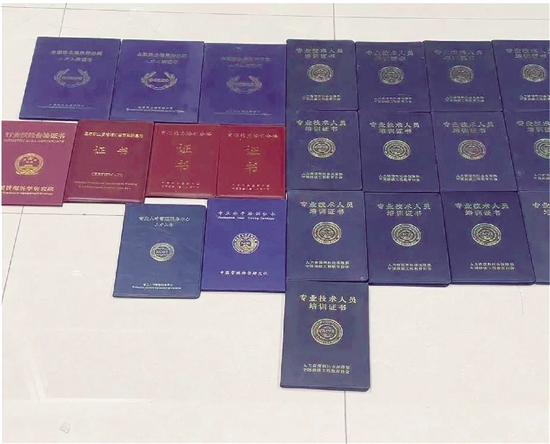 今年上半年上海警方办案时缴获的资格证书。