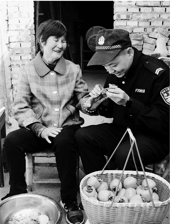 重阳节来临之际,天台县公安局流动人口服务中心在辖区开展“关爱老人 情暖夕阳”活动,工作人员与老人拉家常、话近况,宣传防范养老诈骗、电信诈骗等知识,为老人们送去温暖和关爱。图为10月22日,流动人口服务中心工作人员在福溪街道莪园村为老人送关爱。