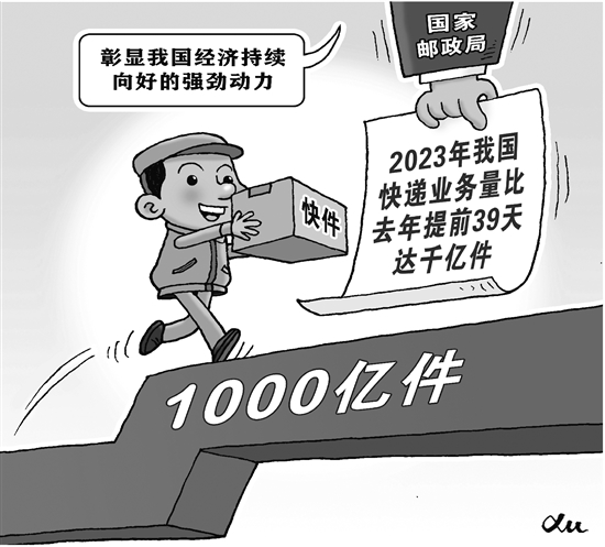 记者从国家邮政局获悉,10月23日上午7时39分,2023年我国第1000亿件快件产生,比2022年达到千亿件提前39天,彰显我国经济持续向好的强劲动力。