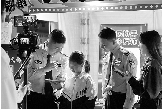 近日,温州市龙湾区沙城街道“沧宁文体公园潮玩美食节”上,沙城派出所民警也摆起了摊位,当起了反诈主播,以通俗易懂的方式剖析骗子套路、宣讲反诈知识。