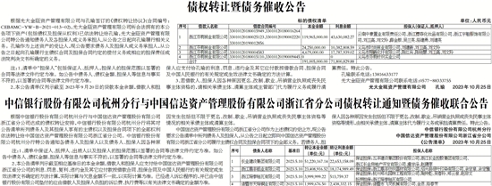 中信银行股份有限公司杭州分行与中国信达资产管理股份有限公司浙江省分公司债权转让通知暨债务催收联合公告