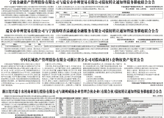 根据宁波金融资产管理股份有限公司与瑞安市申州贸易有限公司签署的《债权转让协议》,宁波金融资产管理股份有限公司已将其对下列借款人及其担保人享有的全部权利(包括但不限于担保债权、违约金债权、损失赔偿权、利息债权)依法转让给瑞安市申州贸易有限公司。宁波金融资产管理股份有限公司与瑞安市申州贸易有限公司联合公告通知各借款人及担保人以及其他相关各方。