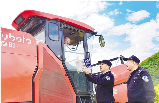近日,三门县公安局横渡派出所民辅警走进田间地头,与群众面对面讲解交通安全和反诈知识,提高群众安全意识,确保“平安秋收”。图为民警向收割机驾驶员宣传反诈知识。 通讯员 林利军