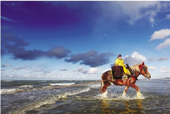在比利时东代恩凯尔克,当海水退潮时,渔民们将特制的渔网拴在马后,骑着马在沿海浅滩缓慢行进,以此收获北海灰虾和鱼蟹。联合国教科文组织已将骑马捕虾列入人类非物质文化遗产名录。