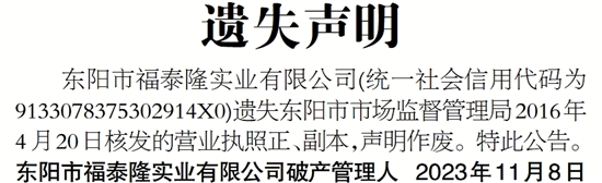 东阳市福泰隆实业有限公司破产管理人 2023年11月8日