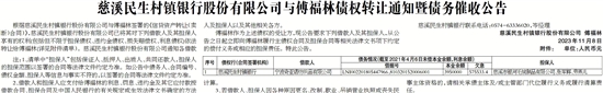 根据慈溪民生村镇银行股份有限公司与傅福林签署的《信贷资产转让(卖断)合同)》,慈溪民生村镇银行股份有限公司已将其对下列借款人及其担保人享有的权利(包括但不限于担保债权、违约金债权、损失赔偿权、利息债权)依法转让给傅福林(详见附件清单)。慈溪民生村镇银行股份有限公司通知各借款人及担保人以及其他相关各方。