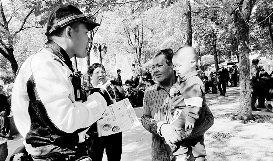 近日,天台县公安局交警大队民警走进社区,利用老百姓茶余饭后的休闲娱乐时间,开展道路交通安全教育宣传活动。图为交警在福溪街道幸福花苑讲解防范知识。 通讯员 鲍彩红