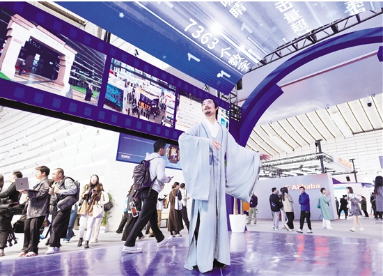 11月7日,2023年世界互联网大会“互联网之光”博览会开幕。作为在世界互联网大会乌镇峰会的重要品牌活动,“互联网之光”博览会也迎来了办展第十年。图为身着汉服的观众走在记录博览会历史的“拾光”隧道里。
