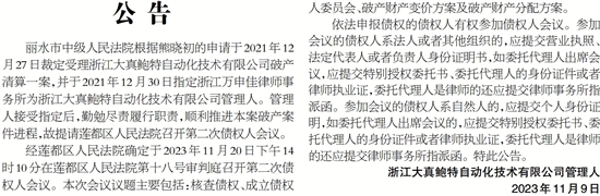 经莲都区人民法院确定于2023年11月20日下午14时10分在莲都区人民法院第十八号审判庭召开第二次债权人会议。本次会议议题主要包括:核查债权、成立债权人委员会、破产财产变价方案及破产财产分配方案。