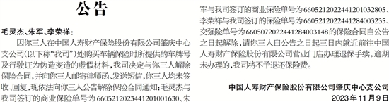 因你三人在中国人寿财产保险股份有限公司肇庆中心支公司(以下称“我司”)处购买车辆保险时所提供的车牌号及行驶证为伪造变造的虚假材料,我司决定与你三人解除保险合同,并向你三人邮寄律师函、发送短信,你三人均未签收、回复,现依法向你三人公告解除保险合同通知:毛灵杰与我司签订的商业保险单号为6605212023441201001630、朱军与我司签订的商业保险单号为6605212022441201032805、李荣祥与我司签订的保险单号为6605212022441284003235、交强险单号为6605072022441284003148的保险合同自公告之日起解除,请你三人自公告之日起三日内就近前往中国人寿财产保险股份有限公司营业门店办理退保手续,逾期未办理的,我司将不予退还保险费。