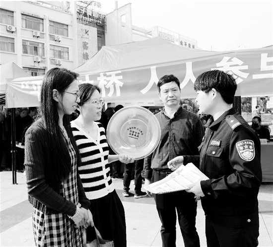 近日,临海市公安局杜桥派出所会同镇综治办,在街心公园开展反诈、禁毒等平安宣传活动。图为民警向群众派送“禁毒脸盆”,同时科普毒品的危害。