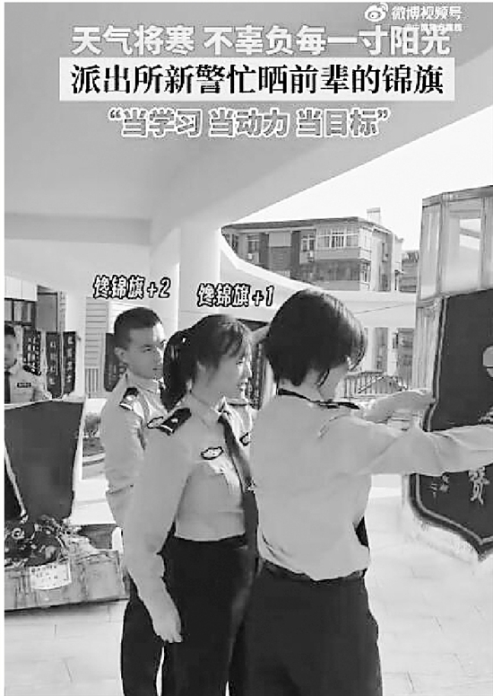 初冬暖阳,天气晴好,湖北黄石胜阳港派出所4名新警将仓库中堆积的成箱锦旗拉到院子里晒一晒,防止入冬受潮。这沉甸甸的锦旗,每一面都有一个温暖的故事,饱含着群众的认可。几位新警边晒边说,这是满满的获得感,会以此当作学习动力和工作目标。