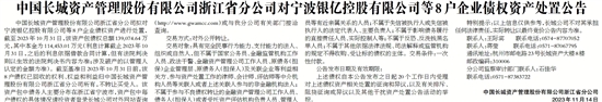 中国长城资产管理股份有限公司浙江省分公司对宁波银亿控股有限公司等8户企业债权资产处置公告