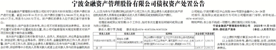 宁波金融资产管理股份有限公司拟对宁波华大针织有限公司单户债权资产进行处置。截至2023年10月27日,该户债权总额为5,788.89万元,本金为2,435.17万元,利息为3,353.72万元。该户债权的债务人位于浙江省宁波市象山。