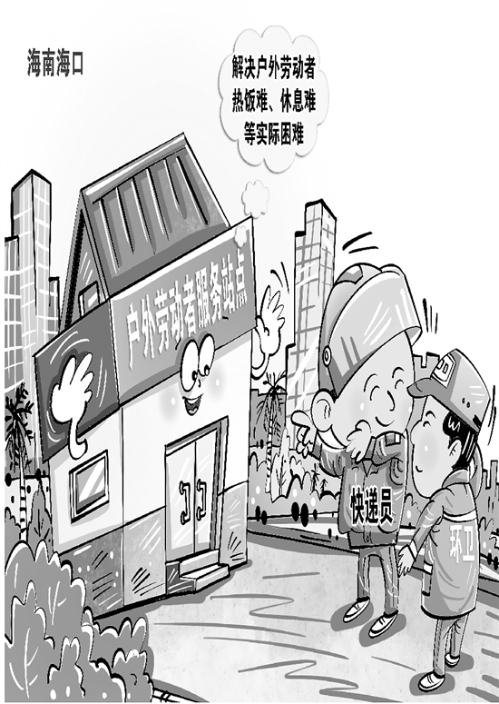 为解决户外劳动者热饭难、休息难等实际困难,近年来,海口市推动建设户外劳动者服务站点、驿站,为广大户外劳动者提供“热可纳凉、冷可取暖、渴可喝水、累可歇脚”的便利休息环境。