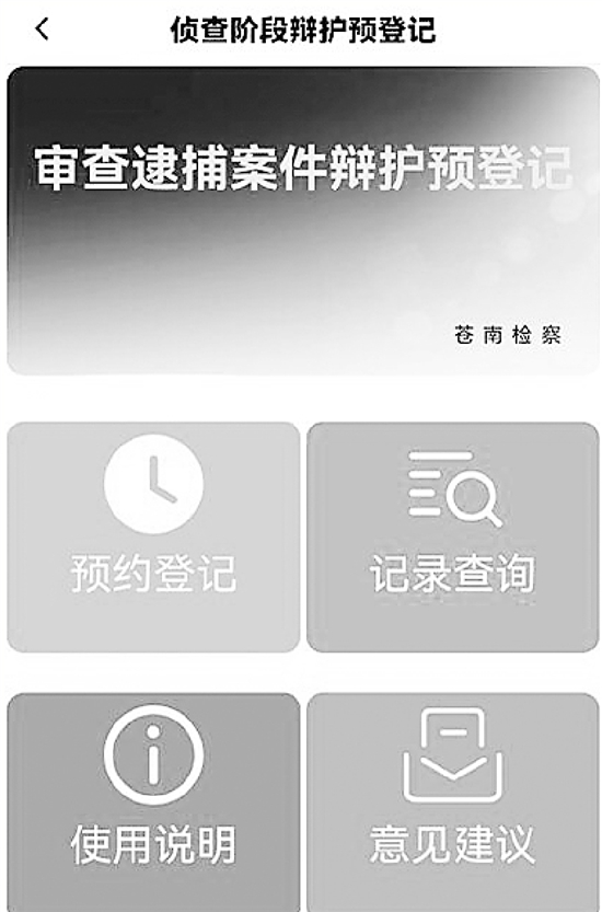 为落实最高检与司法部、中华全国律师协会联合印发的《关于依法保障律师执业权利的十条意见》,充分保障律师对案件办理重要程序性事项的知情权,今年7月,苍南县检察院在浙江检察APP“律师服务”板块开发并上线全省首个审查逮捕阶段辩护预登记平台。