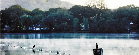 11月13日,杭州遭遇降温,早晨最低气温只有4.4℃。由于温差变化,西湖景区小南湖水域形成烟波浩渺的美丽画卷。