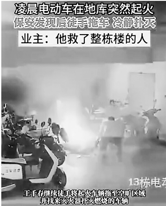 “他救了整栋楼的人。”近日,海南海口一小区内电动车突然冒烟起火。危急时刻,机动巡逻的保安王千春发现了险情,他徒手拖车,冷静灭火,顺利将火灾扑灭于起始阶段,避免了更大损失。
