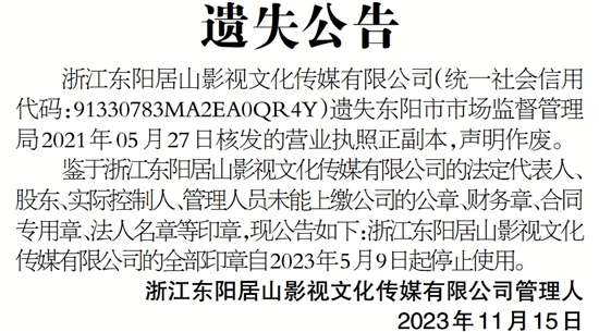 鉴于浙江东阳居山影视文化传媒有限公司的法定代表人、股东、实际控制人、管理人员未能上缴公司的公章、财务章、合同专用章、法人名章等印章,现公告如下:浙江东阳居山影视文化传媒有限公司的全部印章自2023年5月9日起停止使用。