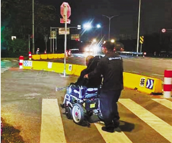 近日,平湖市新埭派出所的两位执勤辅警在深夜巡逻时,发现街边有位老人坐在轮椅上发呆。两人赶紧上前,询问得知老人忘记了回家路。