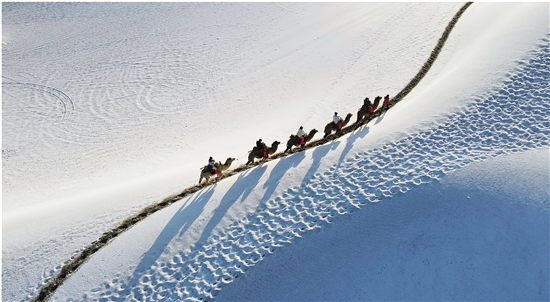 11月14日晚,甘肃省敦煌市迎来入冬以来的首场降雪。雪后的鸣沙山月牙泉景区银装素裹,景色如画,美不胜收。