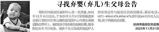现杭州市临安区福利中心有一名男童,2022年12月15日出生,于2023年3月5日发现被遗弃在浙江省杭州市青山湖街道花园中心外围东南侧道路边草坪上。被捡拾时用淡黄色抱被包裹,随身附出生年月日纸条。请孩子生父母或其他监护人持有效证件与临安区民政局联系,联系电话:0571-89541478、89541479,即日起60日内无人认领,孩子将被依法安置。
