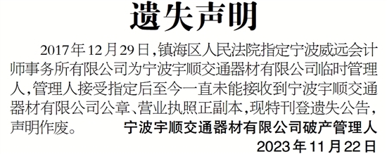 2017年12月29日,镇海区人民法院指定宁波威远会计师事务所有限公司为宁波宇顺交通器材有限公司临时管理人,管理人接受指定后至今一直未能接收到宁波宇顺交通器材有限公司公章、营业执照正副本,现特刊登遗失公告,声明作废。 宁波宇顺交通器材有限公司破产管理人