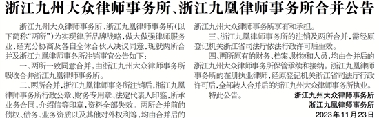 浙江九州大众律师事务所、浙江九凰律师事务所合并公告
