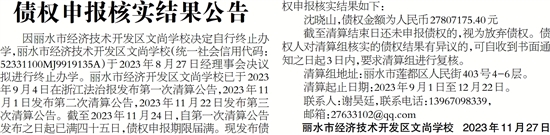 因丽水市经济技术开发区文尚学校决定自行终止办学,丽水市经济技术开发区文尚学校(统一社会信用代码:52331100MJ9919135A)于2023年8月27日经理事会决议拟进行终止办学。丽水市经济开发区文尚学校已于2023年9月4日在浙江法治报发布第一次清算公告,2023年11月1日发布第二次清算公告,2023年11月22日发布第三次清算公告。截至2023年11月24日,自第一次清算公告发布之日起已满四十五日,债权申报期限届满。现发布债权申报核实结果如下: