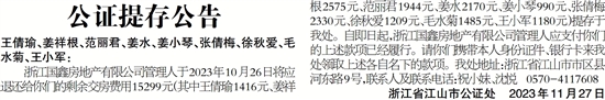 浙江国鑫房地产有限公司管理人于2023年10月26日将应退还给你们的剩余交房费用15299元(其中王倩瑜1416元、姜祥根2575元、范丽君1944元、姜水2170元、姜小琴990元、张倩梅2330元、徐秋爱1209元、毛水菊1485元、王小军1180元)提存于我处。自即日起,浙江国鑫房地产有限公司管理人应支付你们的上述款项已经履行。请你们携带本人身份证件、银行卡来我处领取上述各自名下的款项。我处地址:浙江省江山市市区县河东路9号,联系人及联系电话:祝小妹、沈悦 0570-4117608