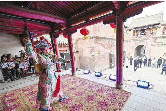 | 演员顾欣蕊在蔚县暖泉镇西古堡村的双耳戏楼表演蔚县秧歌《扈家庄》选段(11月26日摄)。蔚县秧歌是河北省蔚县传统戏剧,国家级非物质文化遗产。 河北省张家口市蔚县暖泉镇西古堡村始建于明朝,当地古民居、古寺庙、古街巷、古戏楼一应俱全,还保持着明清时期的建筑风格。近年来,蔚县坚持古堡保护与开发并重,持续促进文化遗产与经济社会有机融合。 新华社 陈晔华 摄 |