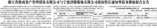 根据浙江省浙商资产管理股份有限公司与宁波泽隆服饰有限公司签署的《债权转让协议》(协议编号:JX2-BW4SMZZ-ZZSMZZ日期: 2023年10月27日),浙江省浙商资产管理股份有限公司已将其对下列借款人及其担保人项下享有的全部权利(包括但不限于主债权、担保债权、违约金债权、利息债权、损失赔偿权)依法转让给宁波泽隆服饰有限公司。浙江省浙商资产管理股份有限公司与宁波泽隆服饰有限公司联合公告通知各借款人及担保人以及其他相关各方。