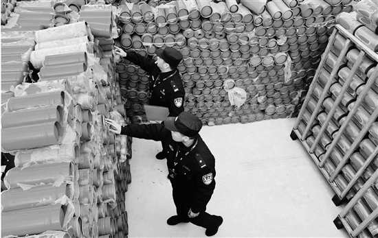 近日,天台县公安局破获一起特大生产、销售伪劣灭火器案件,查获扣押伪劣灭火器成品及罐体5万余个、不符合标准的干粉材料30余吨,涉案金额高达6000多万元,成功摧毁一条横跨福建、浙江、江苏等多个省份的生产、销售伪劣消防器材产业链。图为民警对扣押的伪劣灭火器进行复查登记。