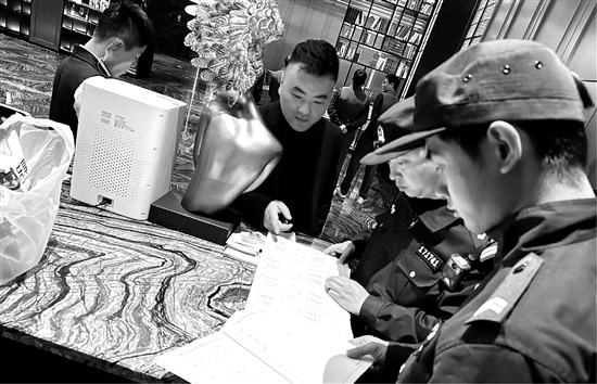 12月20日晚,台州市公安局椒江区分局洪家派出所结合勤廉公安建设,组织警力对辖区娱乐场所开展治安大清查,消除安全隐患,净化娱乐场所治安环境。图为民警在一家娱乐场所检查相关台账。