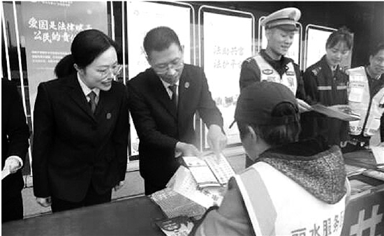 近日,丽水市莲都区人民法院联合浙江省交通集团高速公路丽水管理中心走进丽水服务区,开展“弘扬宪法精神 共建平安交通”普法活动,向过路司机普及相关法律法规,提醒群众严格遵守交通规则,时刻紧绷安全之弦。 通讯员 朱刘上 叶露