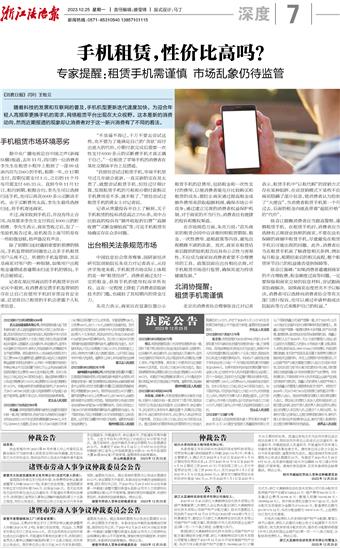 浙江法治报 深度 00007 手机租赁,性价比高吗? 2023-12-25 浙江法治报2023-12-2500007;26536763;26536765 2 2023年12月25日 星期一