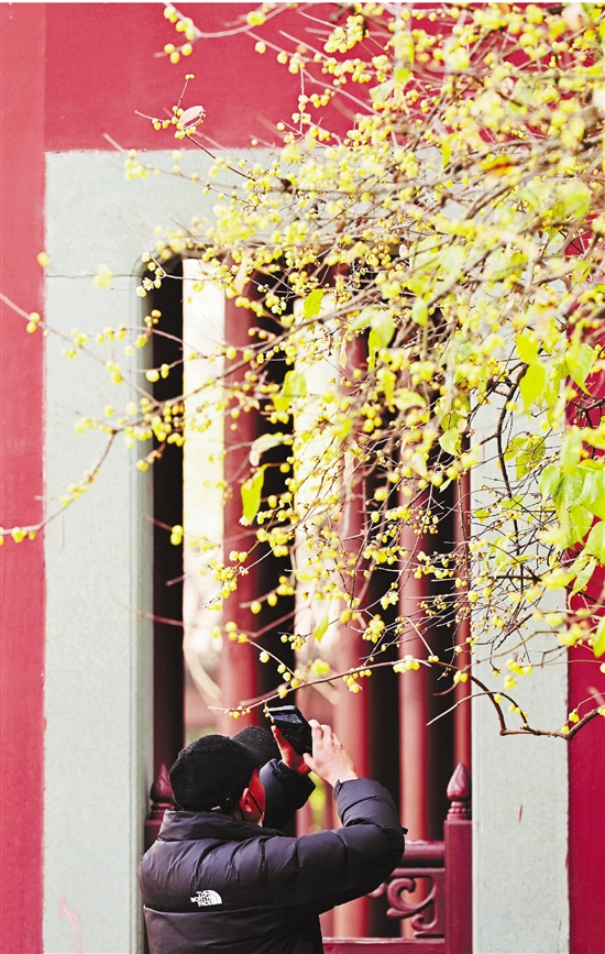 1月4日,杭州钱王祠一株腊梅上的花苞次第盛开,吸引游客拍照留影。近日气温适宜,西湖景区的腊梅逐渐开放。