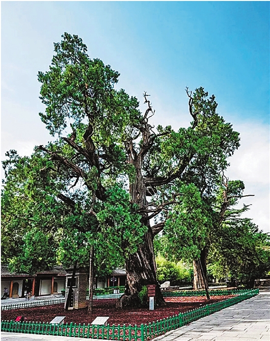 常态化浇水、施肥、生物防虫害外,扩大树盘范围促进植物根系呼吸、设置木质防护围栏等措施,为仓颉手植柏提供了有效保护。