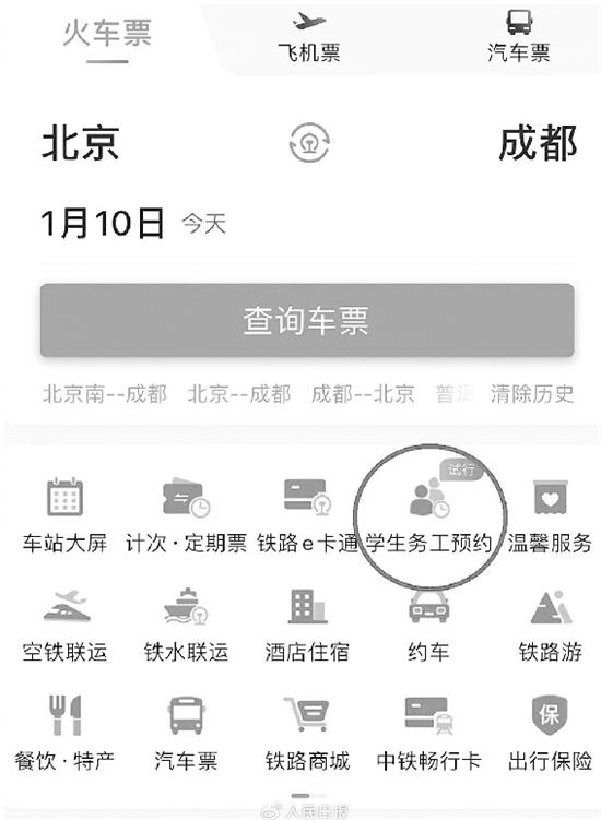 1月10日,铁路12306手机客户端推出春运期间学生、务工人员专区预约购票功能,符合条件的旅客朋友可通过专区预约购买春运期间往返火车票。