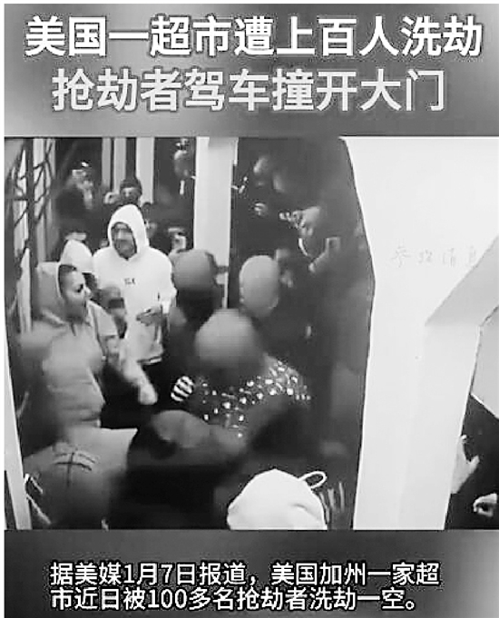 据美媒1月7日报道,美国加州一家超市近日被100多名抢劫者洗劫一空。画面显示,抢劫者驾车将超市大门撞坏,随后冲进店内,将食品、现金、收银机等物品全部掠走。
